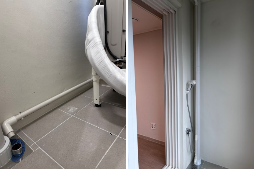 벽 부분으로 빠지는 배관 그리고 드레인관